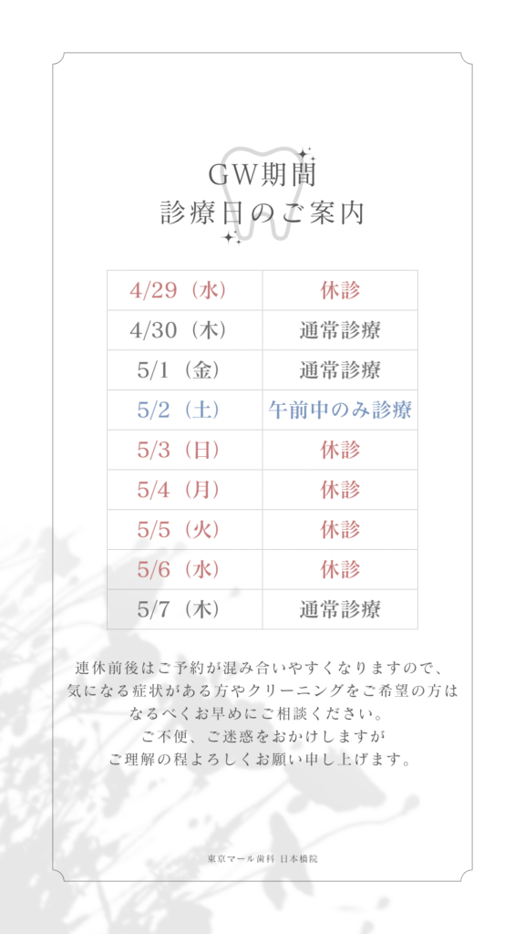 ゴールデンウィーク期間中の診療日程につきまして、下記の通りご案内申し上げます。